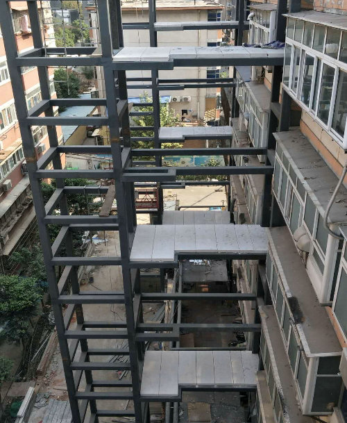 宇通花園位于河南省鄭州市管城區鄭汴路42號,該小區屬于老舊住宅小區加裝電梯。原來走廊設計現澆混凝土,但是重量重,每層面積小,施工難度大,造價高。新型蒸壓輕質加氣混凝土樓板,具有重量輕、定制生產、施工方便快捷。該電梯走廊采用的是厚100mm、長2000mm、寬600mm的加氣混凝土樓板,該規格樓板的荷載為3600N/㎡,完全滿足加氣樓板的荷載要求。