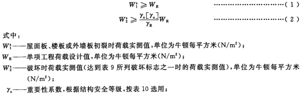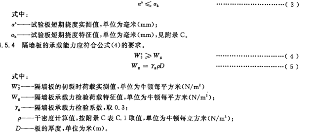 5、進行結構性能檢驗的屋面板、樓板或外墻板符合公式(1)和公式(3)的要求時,判該批板結構性能合格;進行結構性能檢驗的隔墻板符合公式(4)的要求時,判該批板結構 性能合格,若該板不符合有關公式的要求,判該批板不合格。