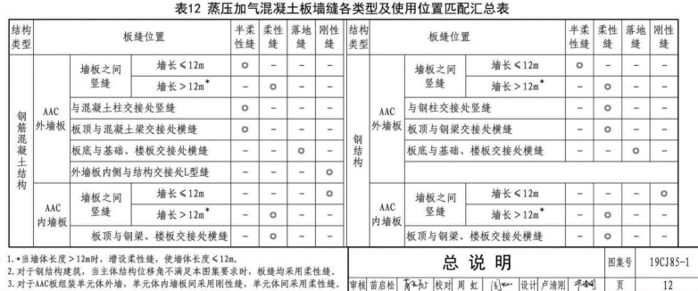 alc輕質板的安裝構造主要參考兩本圖集,一本是2013年12月25日發布的《蒸壓加氣混凝土砌塊、板材構造》13J104圖集,另一本是2019年9月1日實施的《裝配式建筑蒸壓加氣混凝土板圍護系統》19CJ85-1參考圖集。在這兩本參考圖集中,都沒有提到alc輕質板多長需要加構造柱。只是在19CJ85-1參考圖集第12頁表12《蒸壓加氣混凝土板墻縫各類型及使用位置匹配匯總表》總規定,無論是鋼筋混凝土結構,還是鋼結構,當alc輕質板的墻長大于等于12m時,需增設柔性縫,使的墻體長度小于12m。